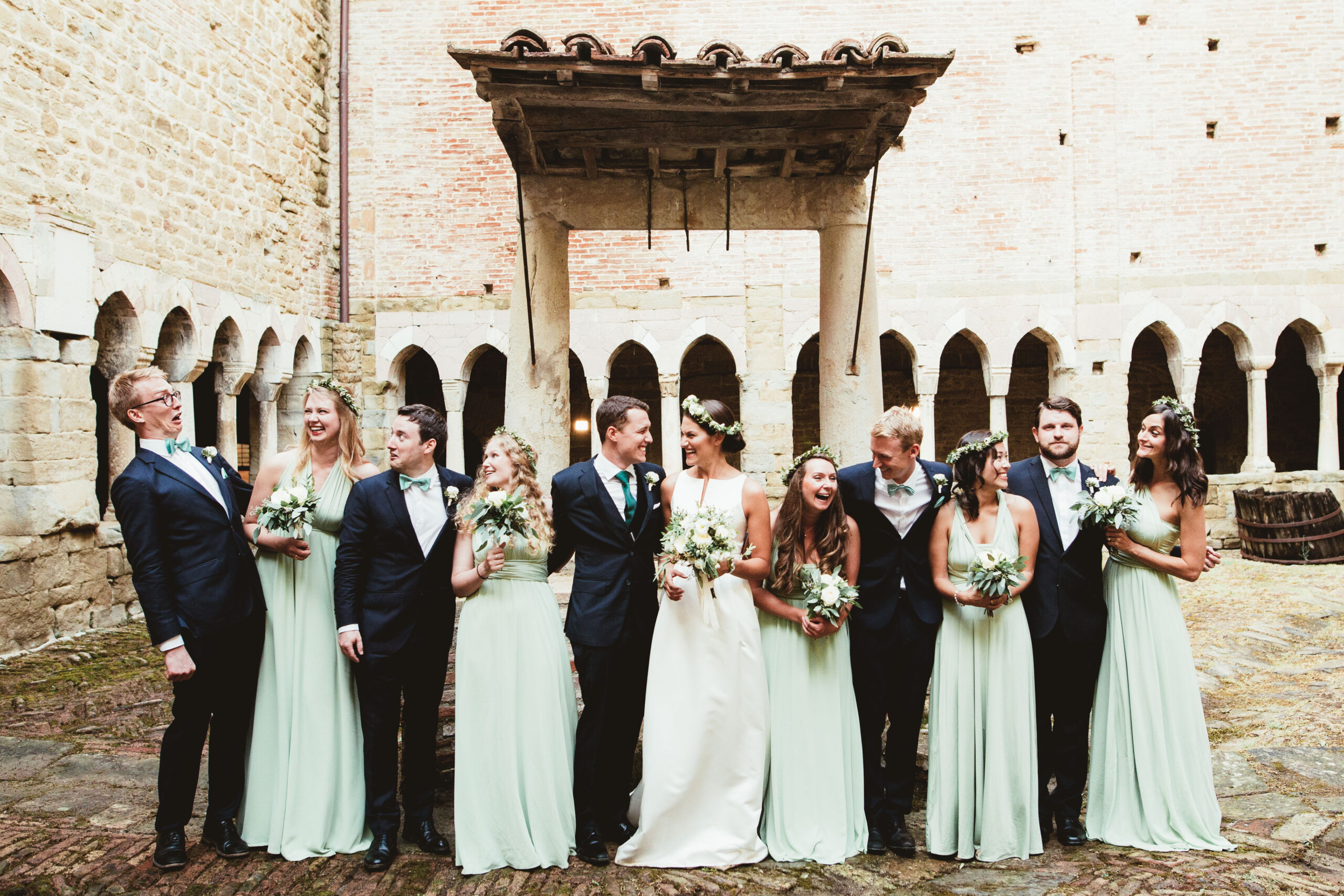 Paired with their delicate flower crowns, the look was effortlessly stylish, blending beautifully with the natural setting. The bride felt so fortunate to have such stunning friends by her side during her Italian wedding!